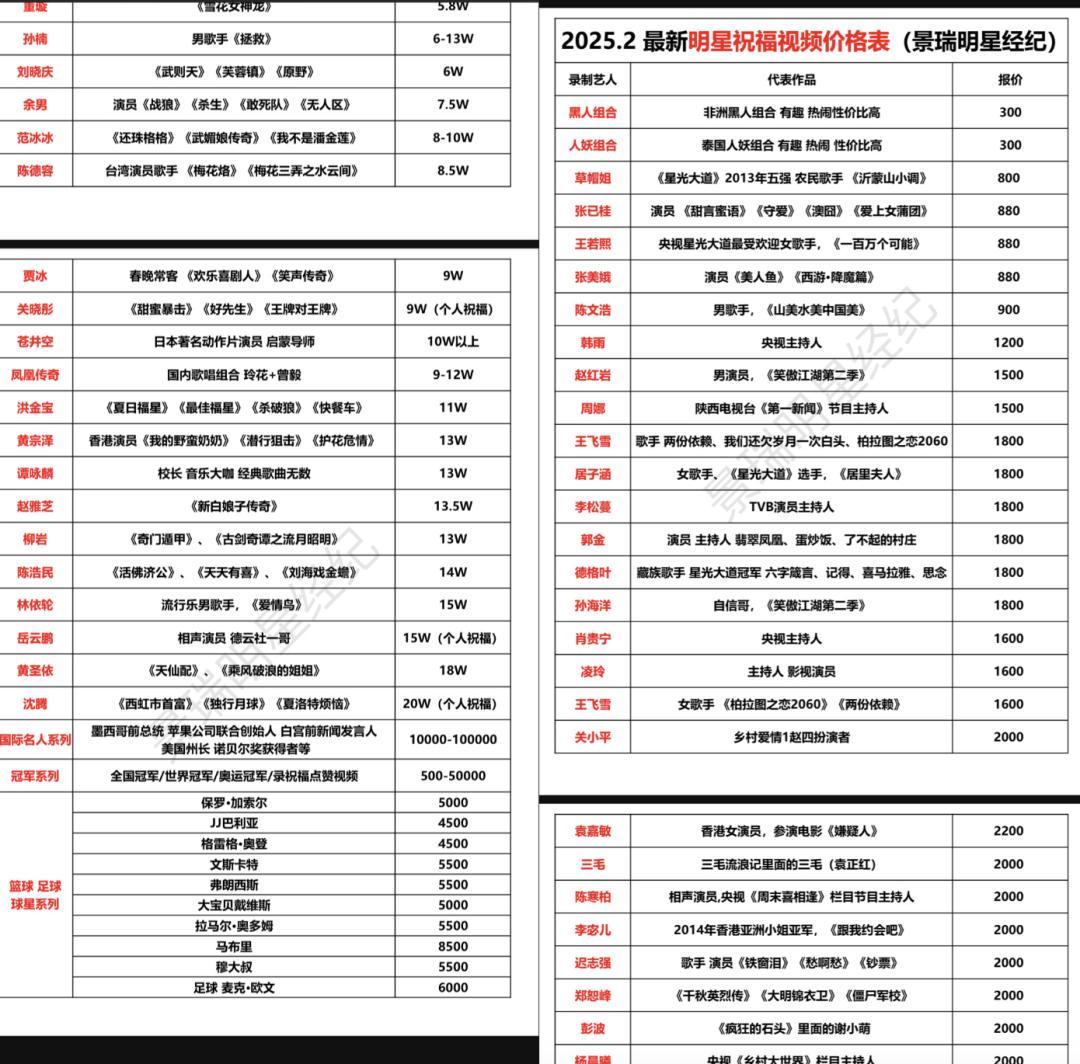 值得注意的是,除演艺明星外,这份名单还延伸至国际领域。包括国内外体育明星、知名主持人,部分中介甚至能提供墨西哥前总统、苹果联合创始人、白宫前新闻发言人、美国前州长、诺贝尔奖获得者等国际名人,单人报价1.88万元,录制视频为纯英文祝福。