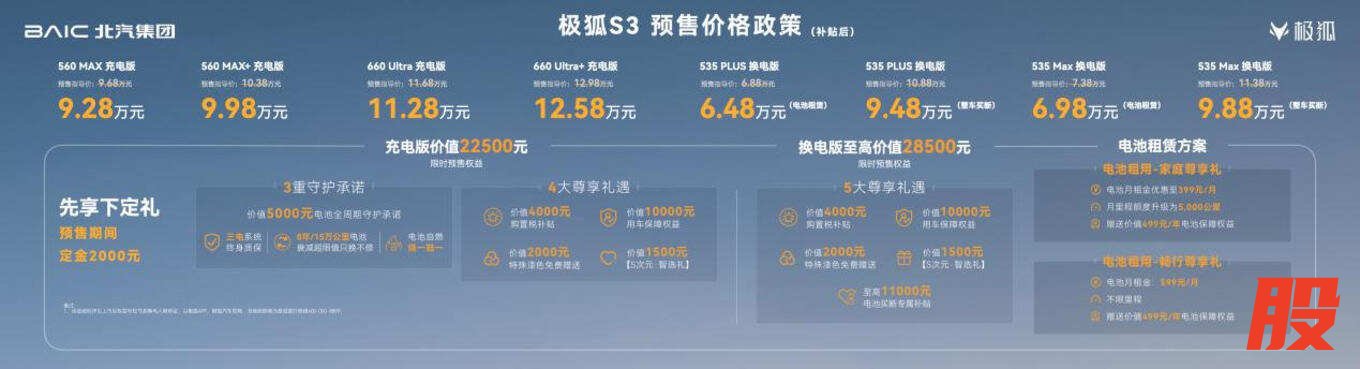 伴随新车预售,极狐为S3准备了价值22500元的限时预售权益,包括享购置税补贴4000元,赠送价值5000元电池全周期守护承诺、价值2000元的特殊漆色、价值1500元的S次元·智选礼,以及价值10000元的用车保障权益。